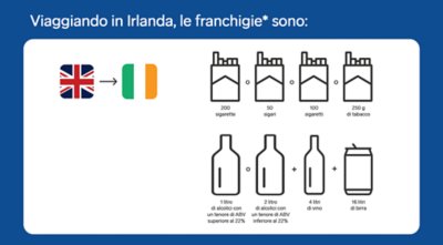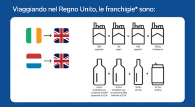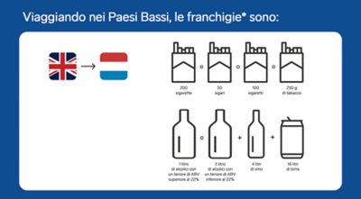 Il duty free è disponibile quando viaggi tra la Gran Bretagna e la Repubblica d’Irlanda o l’Olanda.